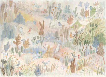 Små fugle blander sig mellem markens strå og blade imens en hare titter frem. Farveskalaen er dæmpet med synlige blyantsstreger. Skøn kunst til væggen i de fleste af boligens rum.