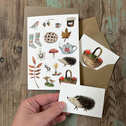 Et kortsæt bestående to minikort og et A6 kort med søde efterårsmotiver til at præge efteråret med hygge og stemning.