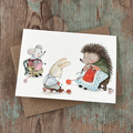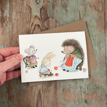 Glæd en strikkeelsker med et sødt kort af tre dyr der sidder sammen og strikker, et kort skabt på baggrund af min oprindelige håndtegnede illustration.
